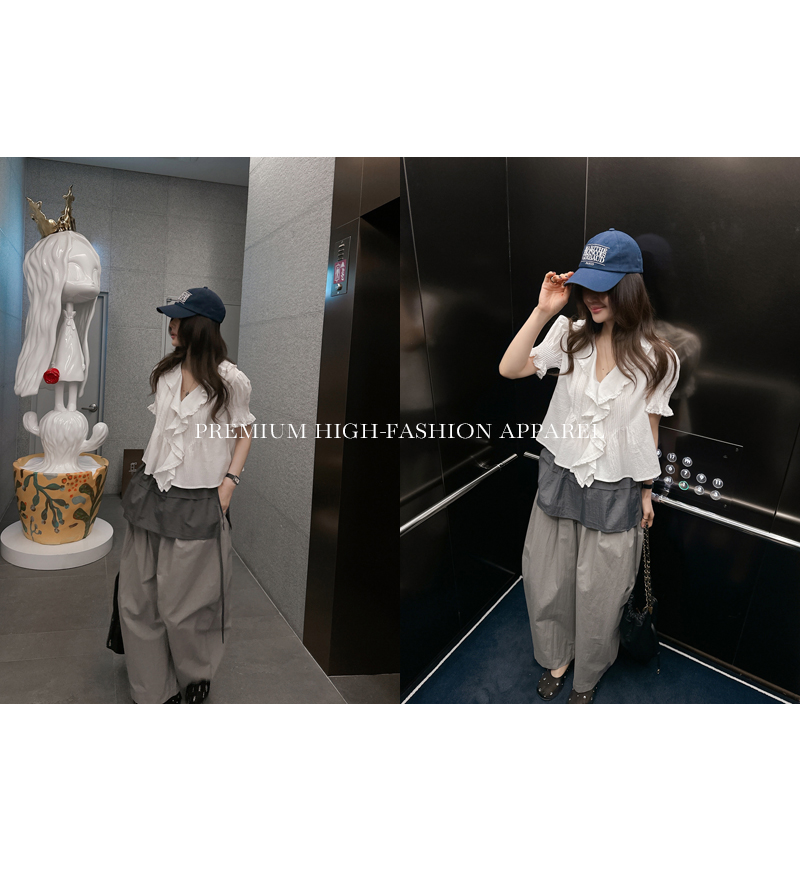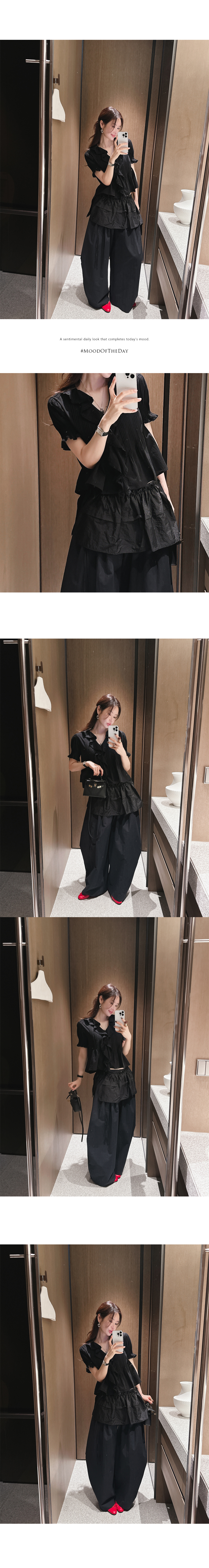 밑단의 은은한 셔링 디테일이 전체적인 볼륨감을 살려주어