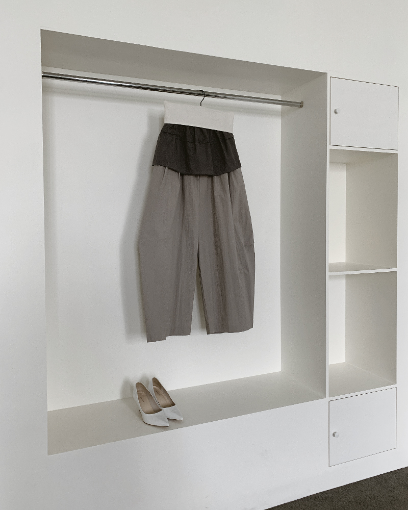 팬츠 위에 랩 스커트를 레이어드한 셋업 제품으로,